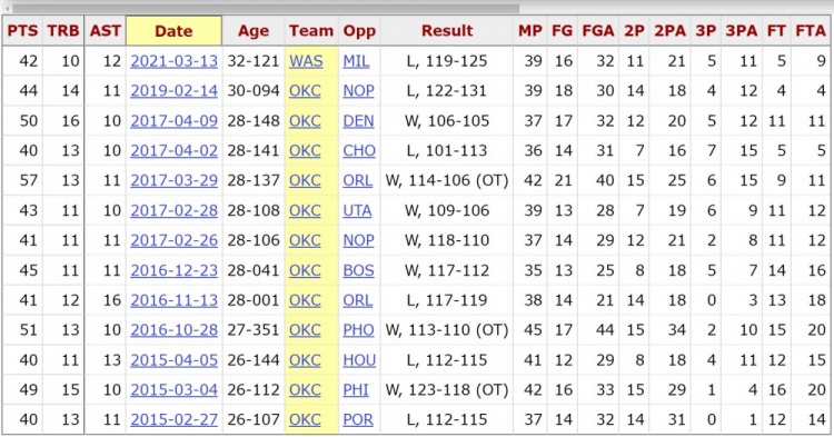 威少生涯至今13次40+三双,其中包括一次57分13篮板11助攻。
